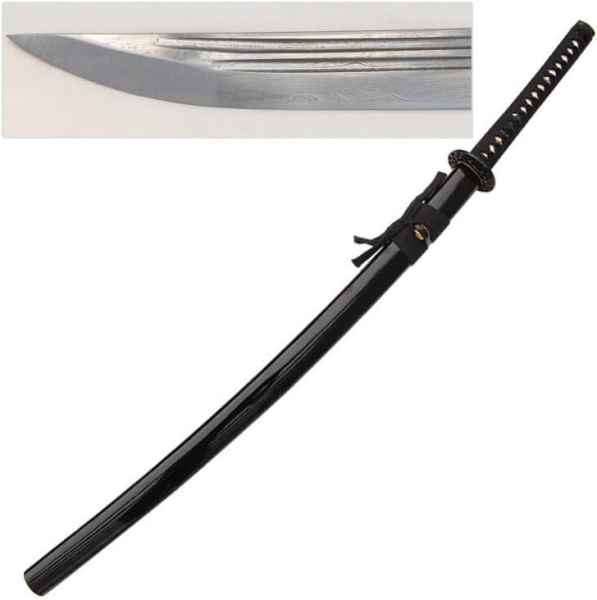Gefaltete Samurai Katana Schwert ,von Hand geschmiedeter 1045 Kohlenstoffstahl Zwei schmale Rille .Gesamtlänge: 107 cm Klingenlänge 73cm,Grifflänge 29cm. lackierte Holz Saya Griffumwicklung aus Baumwolle ist traditionell angebracht das Schwert ist scharf geschliffen .