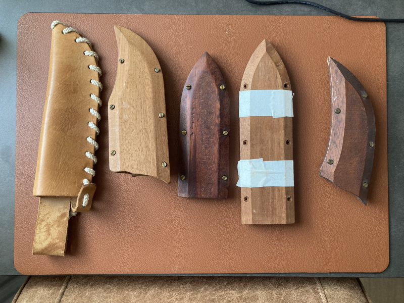 es sind alle zughörigen Scheiden dabei, bis auf die Scheide für das Bowiemesser sind die Scheiden aus Holz, die Bowiescheide ist aus Leder.