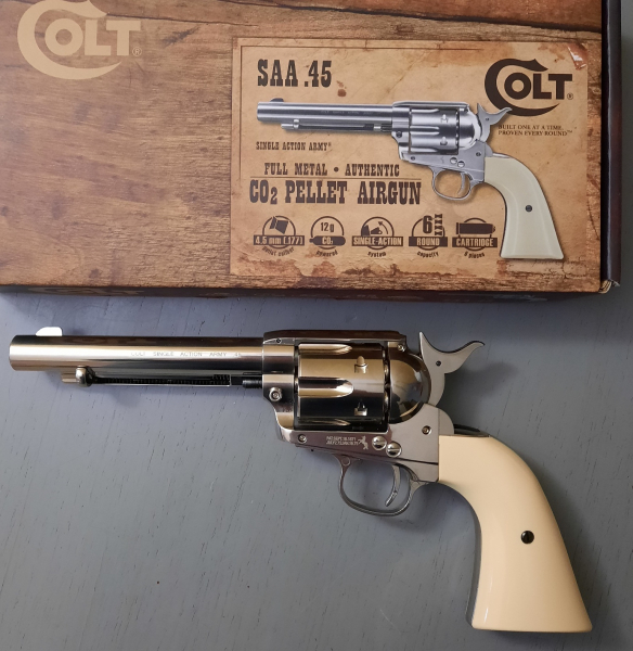 Biete meinen neuwertigen und kaum benutzten CO2-Revolver Colt SAA .45 Single Action Army - Full Metal - Athentic - Ausführung Nickel/Pearl im Kal. 4,5 mm DIABOLO