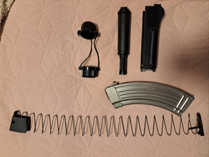 Ich verkaufe ein originales AK47 Deko Magazin (aus Stahl). Die Magazinlippen wurden entfernt, so dass keine Patrone mehr im Magazin hält. Dazu gibt es noch eine weitere Magazinfeder. Zusätzlich verkaufe ich einen oberen und unteren Handschutz (original von Baikal). Dazu kommen noch Schutzkappen für ein Zielfernrohr. Bei Fragen stehe ich Ihnen gerne zur Verfügung. Da es sich um einen Privatverkauf handelt, sind jegliche Gewährleistungsansprüche ausgeschlossen.