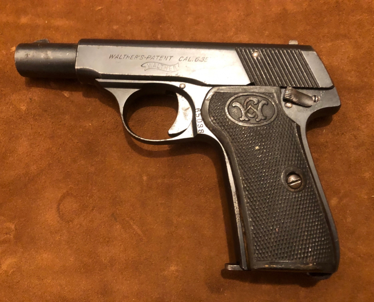 Im Auftrag eines Erben: +++++Pistole Walther Mod. 7, 3. Ausführung, Kal. 6,35 mm.++Vom Modell 7 wurden insgesamt nur 57500 Stück hergestellt. Die 3. Ausführung wurde nur ab 1916 bis 1919 in kleinen Stückzahlen hergestellt.++++Das Modell 7 war keine offizielle militärische Dienstwaffe.++Sie wurde aber, wegen ihrer etwas geringeren Größe gerne von Stabsoffizieren privat gekauft und getragen.+++Der Zustand ist gebraucht, aber noch gut.+++Der Lauf ist blank, Züge und Felder gut.++Siehe Fotos.++ Es ist nichts defekt.+++ ***+++++++++++Im Kundenauftrag, daher keine Garantie, Umtausch oder Rücknahme. ++++Versand nur mit Overnite, 41,00 Euro. +++Anliefertag muss telefonisch vereinbart werden!!!!!+++++Kein Versand ins Ausland!!!No EXPORT!!