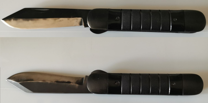 - Klingenmaterial: Kohlenstoffstahl (?), obere Hälfte schwarz, untere Hälfte blanke Optik