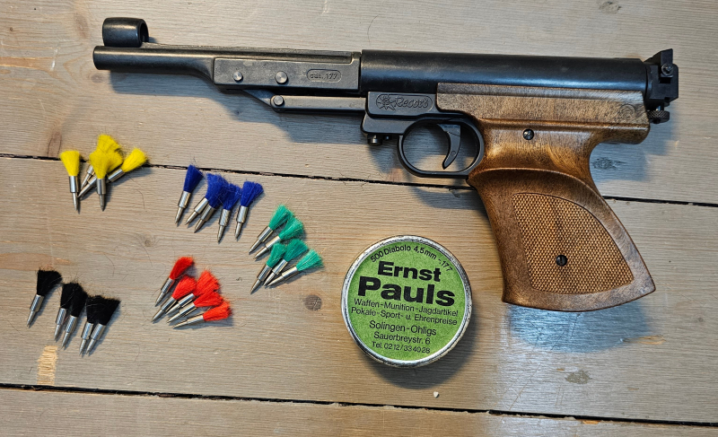 Hier habe ich eine schöne Druckluftpistole zu verkaufen. Es handelt sich um eine unbenutze FB Record 4,5mm, in brüniert mit Kunststoffgriffschale. Waffe ist mittels Knicklauf zu spannen. Lege eine Dose mit ca. 150 Diabolos und Wettkampfspitzen dabei. Rest siehe Foto.