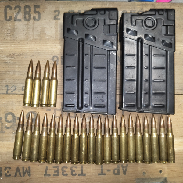 Dazu kommen 24 Deko Patronen im Kaliber 7,62x51 und eine Magazintasche.