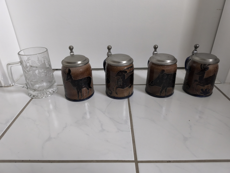 5 Krüge im Set – 4x Steinzeug mit Zinndeckel (Jagdmotive) + 1x Glaskrug (Flugwildmotiv)