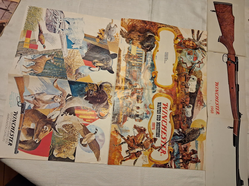 5 alte WINCHESTER-Kataloge (1968, 105 S.), (1969, 52 S.), (1970, 48 S.), (1972, 29 S.), (1975, 25 S.) und 1 alter MARLIN-Katalog (1971, 31 S.). Alle Kataloge von mir selbst in den angegebenen Jahren bei meinem Büchsenmacher mitgenommen (Erstbesitz); altersgemäß sehr guter Zustand (sorgfältig aufbewahrt); es haben wohl nur wenige die letzten 50 Jahre überlebt.