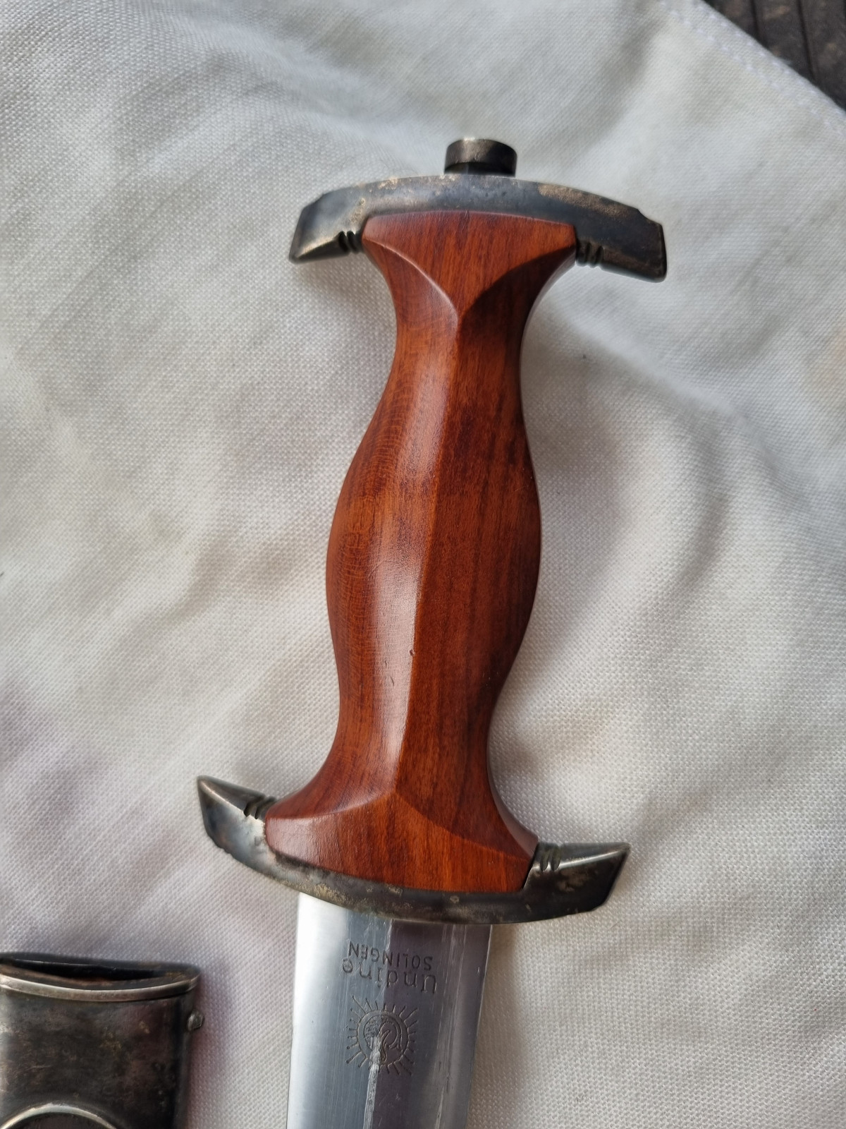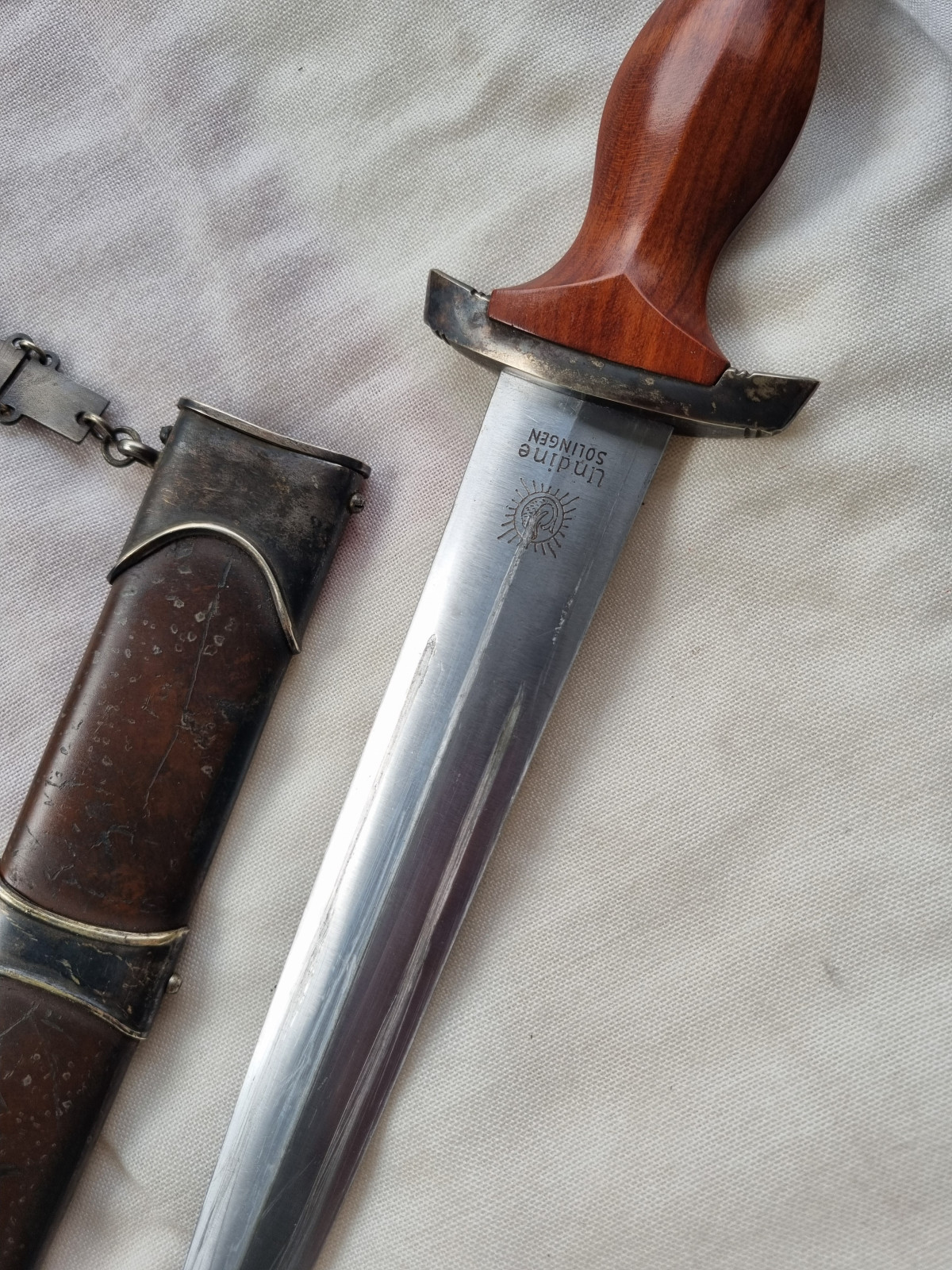 Sehr schöner getragener Zustand. Keine Dellen oder Roststellen. Sehr seltener Hersteller Undine Solingen (Meisenburg KUNO) Die Firma produzierte nur 3000 Dolche für die SA.