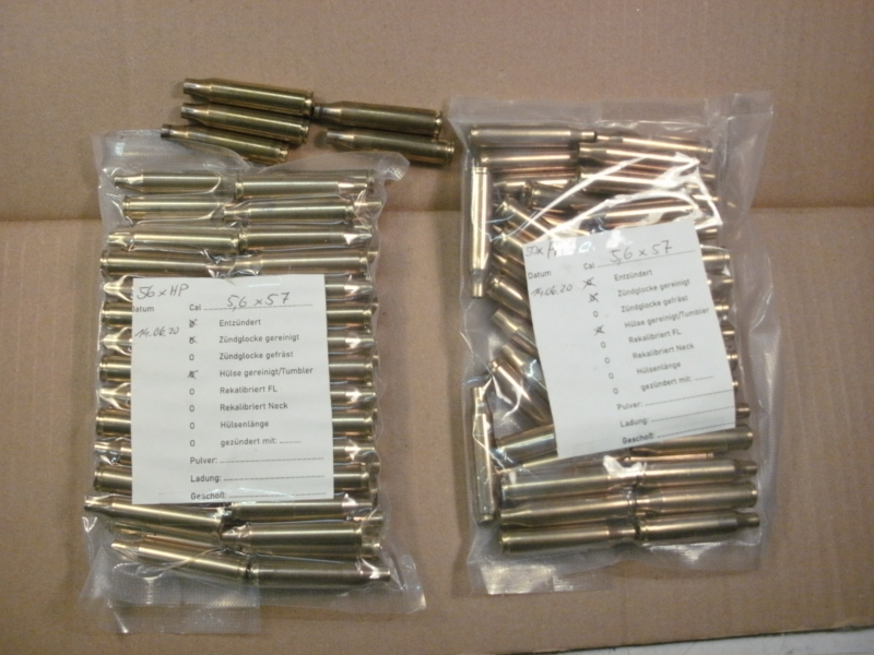111 Hülsen Hirtenberger 5,6 x 57, 1x geschossen, nicht wiedergeladen, entzündert, gereinigt.
