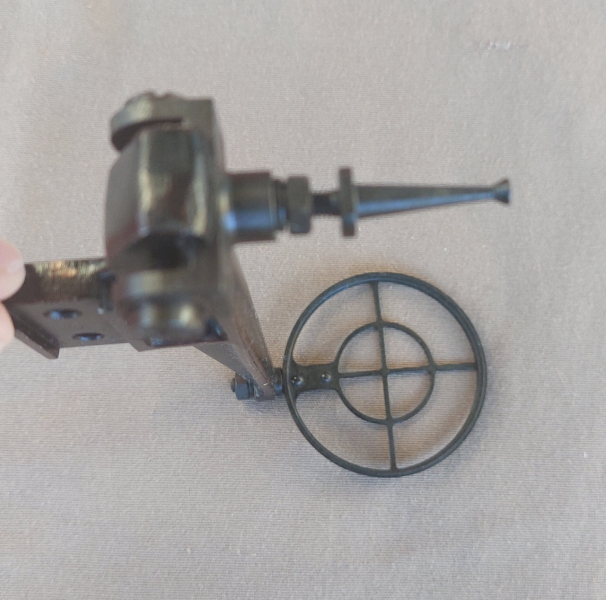 Angeboten wird ein Zielsuchgerät für eine Bordschusswaffe. Dieses Zielsuchgerät wurde bei beweglichen Flugzeug-Maschinengewehren, z.B. MG 15, eingesetzt. Das Zielsuchgerät hat eine Länge von ca. 17 cm und hat einen sehr guten Zustand. Es hat eine Kreiskimme und ein Korn. Die Kreiskimme hat einen Durchmesser von ca. 6,5 cm. Der Verkauf erfolgt unter Ausschluss jeglicher Gewährleistung. Der Ausschluss gilt nicht für Schadenersatzansprüche aus grob fahrlässiger bzw. vorsätzlicher Verletzung von Pflichten des Verkäufers sowie für jede Verletzung von Leben, Körper und Gesundheit.
