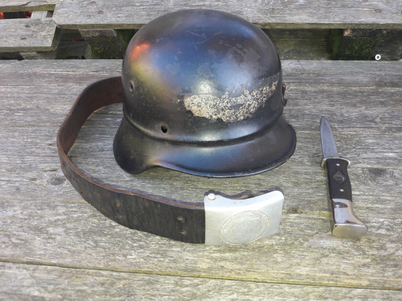 Originales HJ Koppelschloss ( RZM M 4/38 ) & Koppel + HJ Messer + M40 Ausschusshelm ( E.F.62 - 02 ) für HJ Flakhelfer , alles im guten sammelwürdigen Zustand .