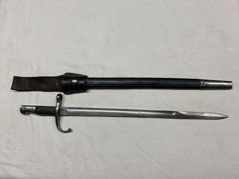 Bajonett, Türkei, Mod. 1890 mit Koppelschuh. Das Bajonett und die Lederscheide sind in einem guten gebrauchten Zustand. Die Nähte sind fest, nichts ist nachgenäht. Leider fehlt die hintere Klammer unten an der Lederscheide. Bajonett Gesamtlänge 58,4 cm, Klingenlänge 45,8 cm und der Laufring innen 15,5 mm. Privatverkauf, keine Garantie oder Rücknahme.