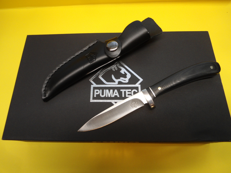 Eine schwarze Lederscheide mit Gürtelschlaufe und eine magnetische PUMA TEC Geschenkbox runden die Ausstattung ab