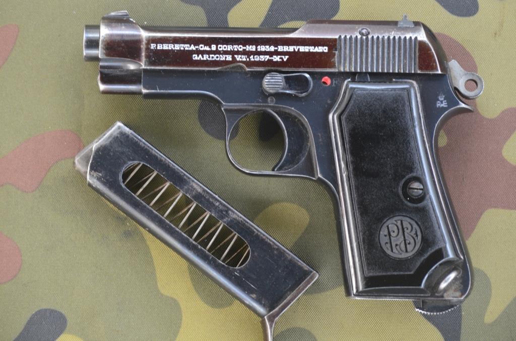 Kaliberangabe, Herstellerbezeichnung „P. BERETTA", Patenthinweis "Brevettato Gardone V.T. 1937-XV". Kaliberangabe „CAL. 9 CORTO“, Modellbezeichnung „Mo 1934“, Seriennummer „624685“. Diverse alte gültige italienische Beschusszeichen (Krone über "RE“), verschnörkeltes Logo „P B“ auf beiden Griffschalen.