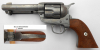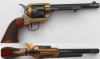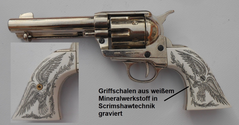 Ein Modell mit einer individuellen Fischhautverschneidung der Holzgriffschalen und das verchromte Modell mit Scrimshawgriffschalen aus einem weißen polierten Mineralwerkstoff. Der schwarze Dekorevolver (mit vermessingtem Griffstück) und auch der verchromte Dekorevolver sind im Bestzustand.