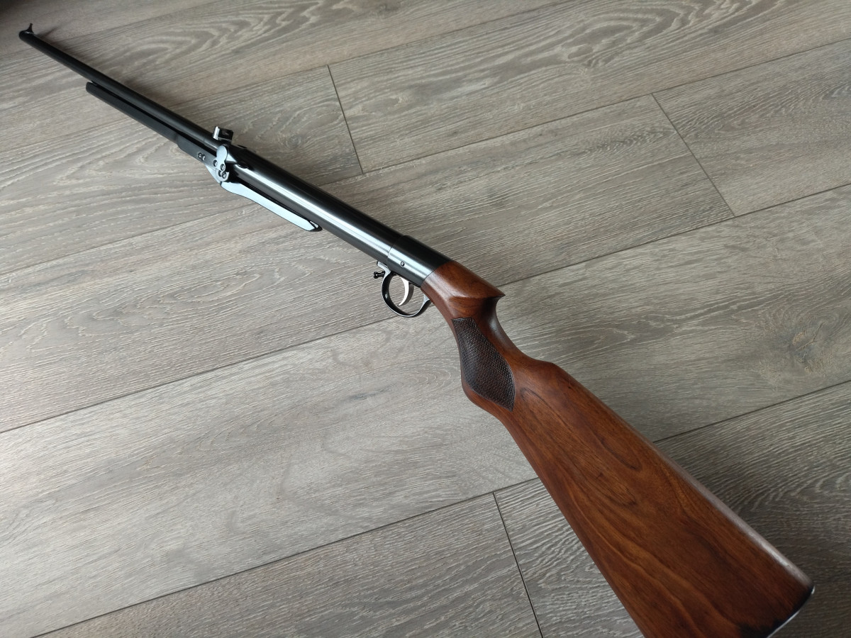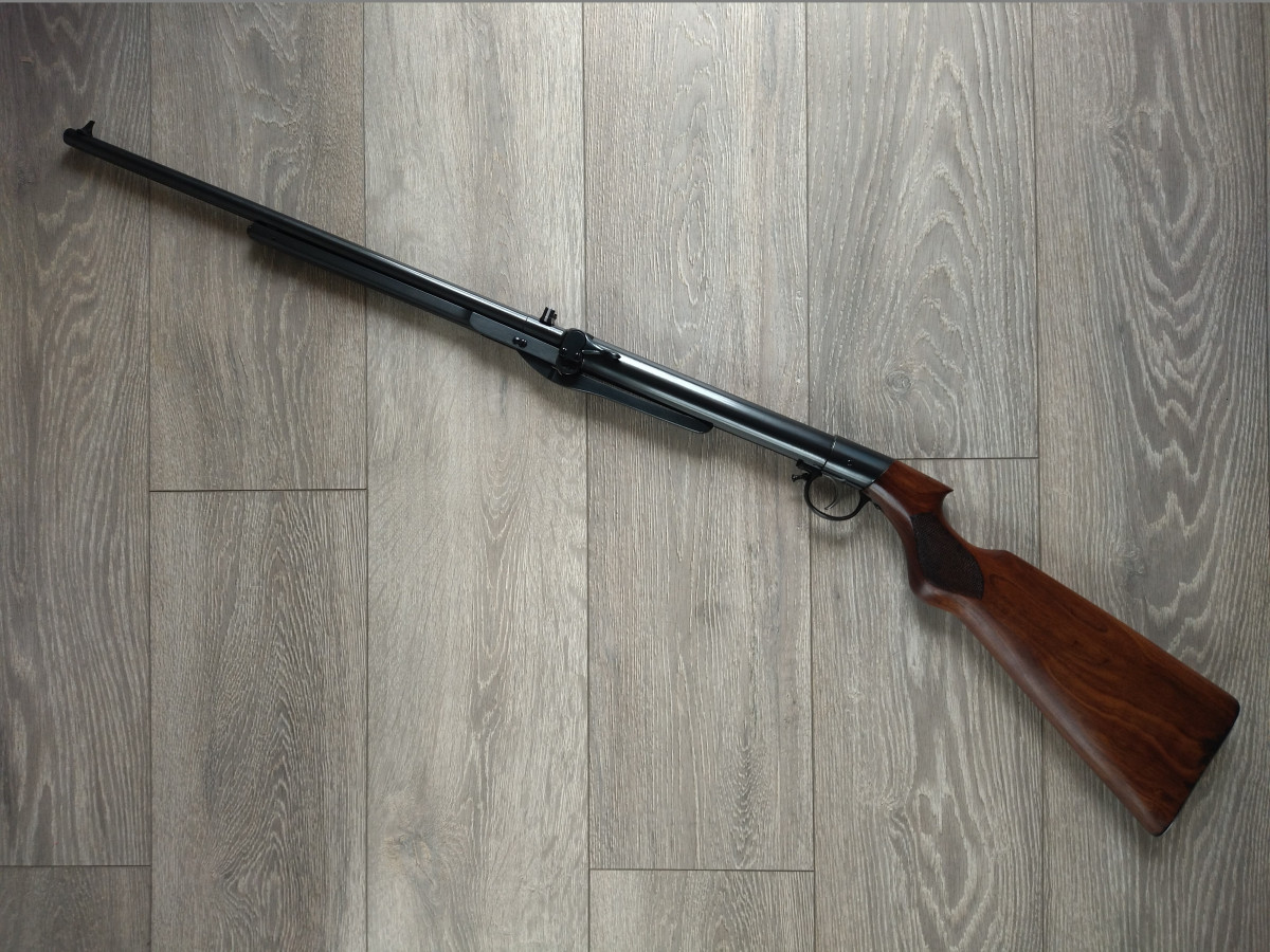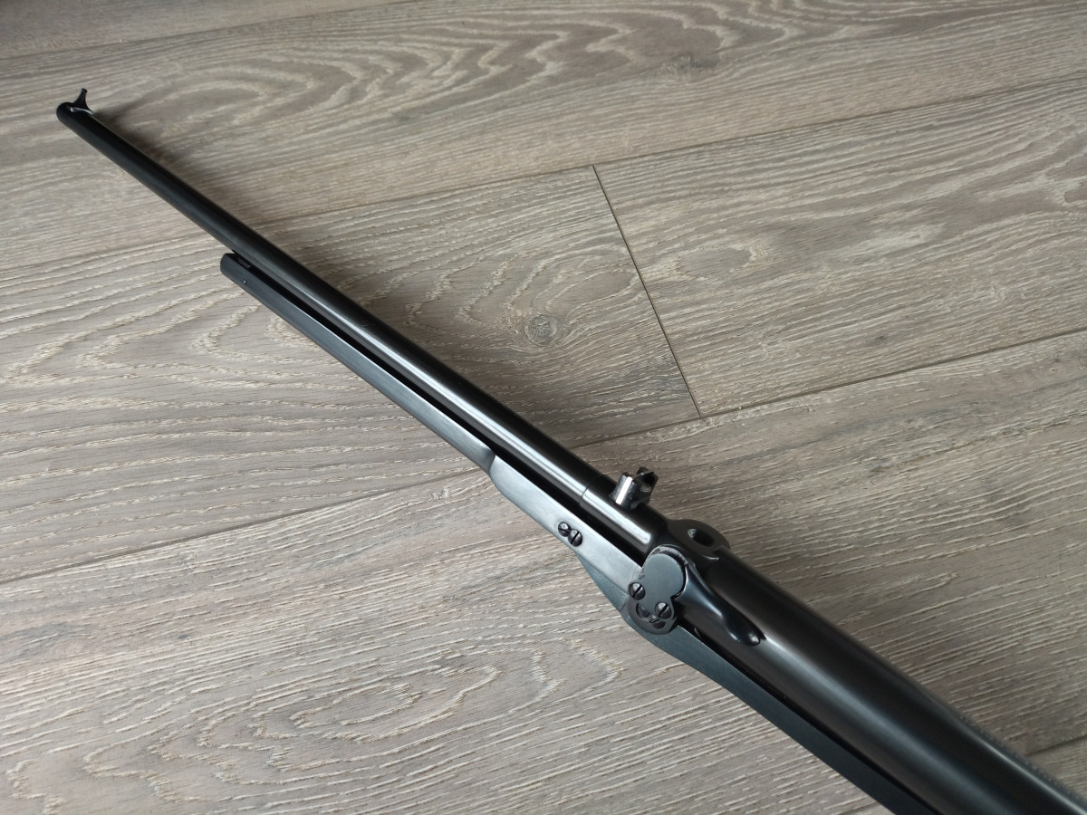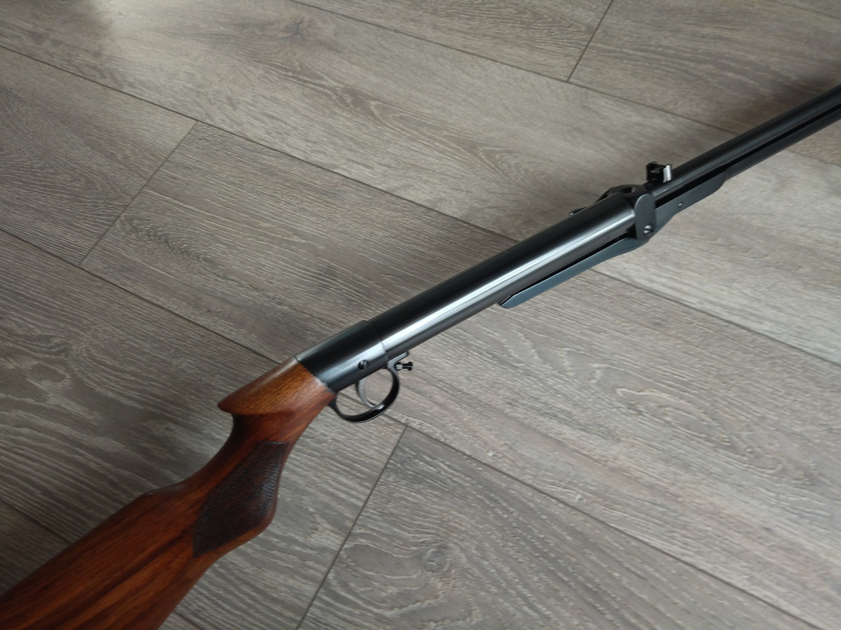 Einzellader unterhebelspanner Luftgewehr, Kaliber 4.5 mm, Lauf gezogen, Länge 1100 mm, Gewicht ca. 3,5 Kg. Nussbaumholz Schaft.