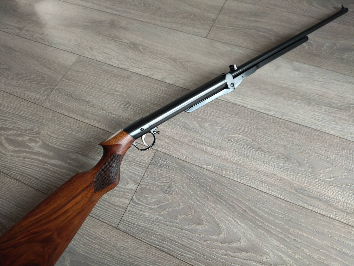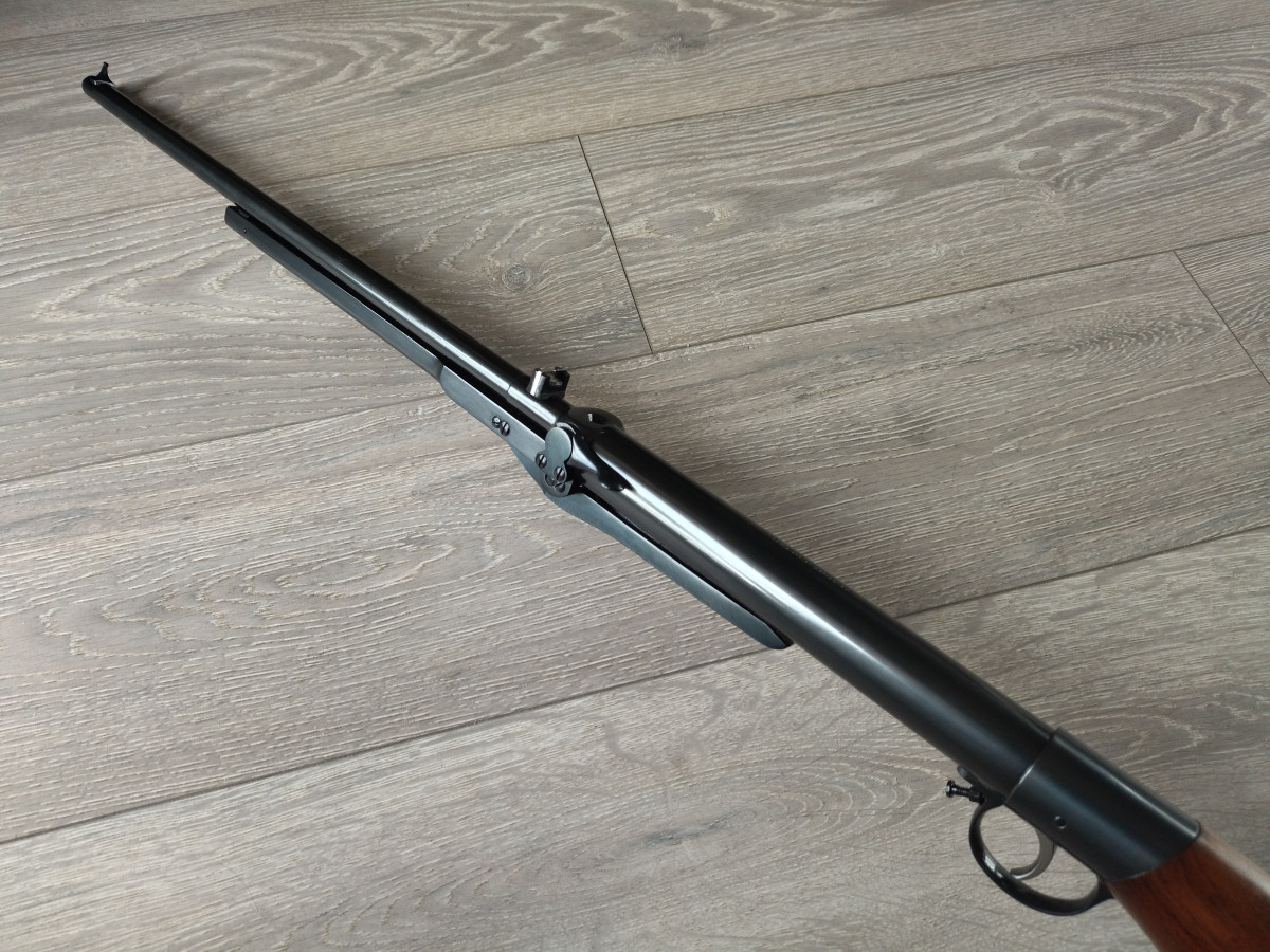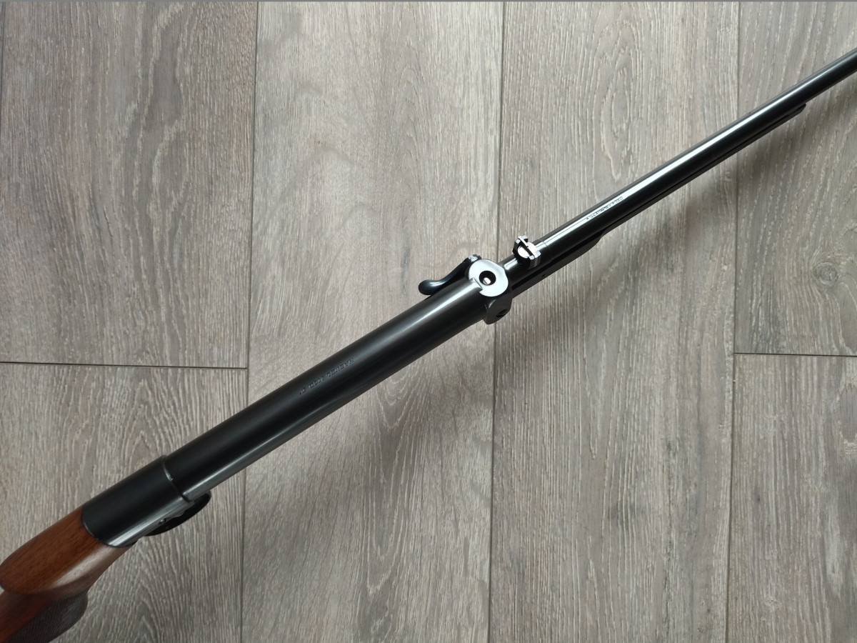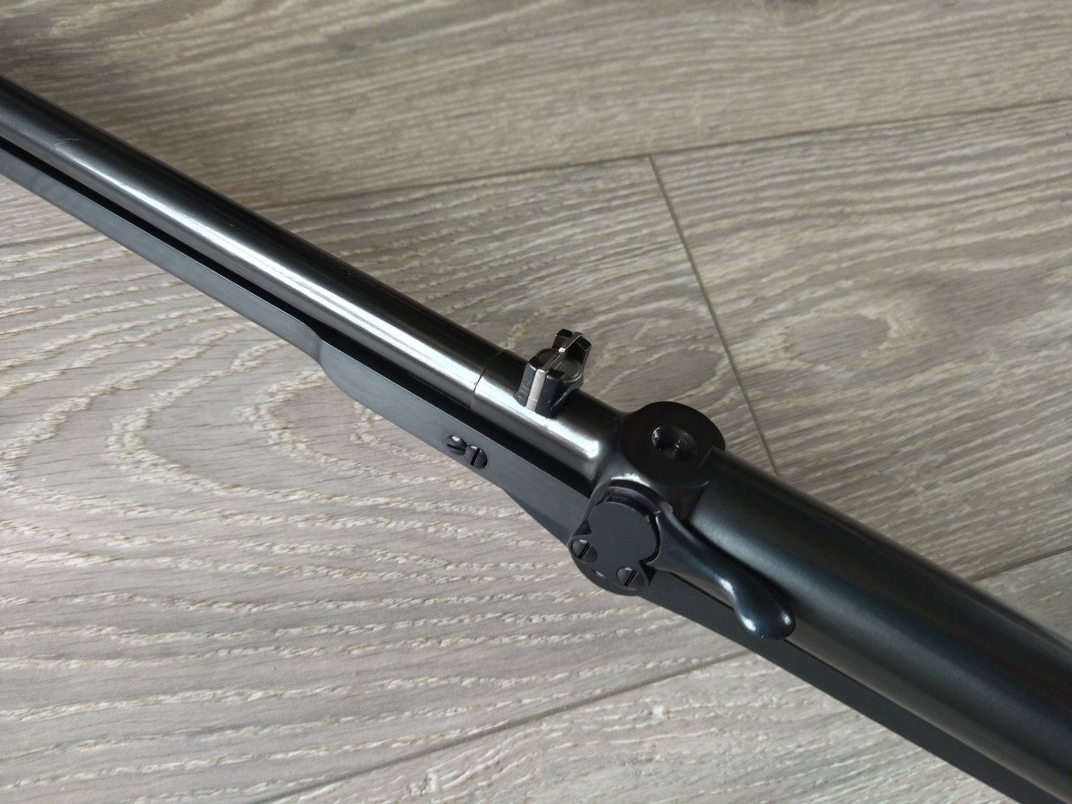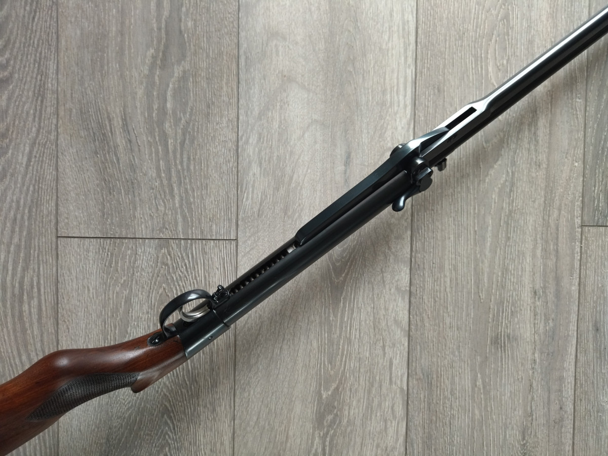 Einzellader unterhebelspanner Luftgewehr, Kaliber 4.5 mm, Lauf gezogen, Länge 1100 mm, Gewicht ca. 3,5 Kg. Nussbaumholz Schaft.