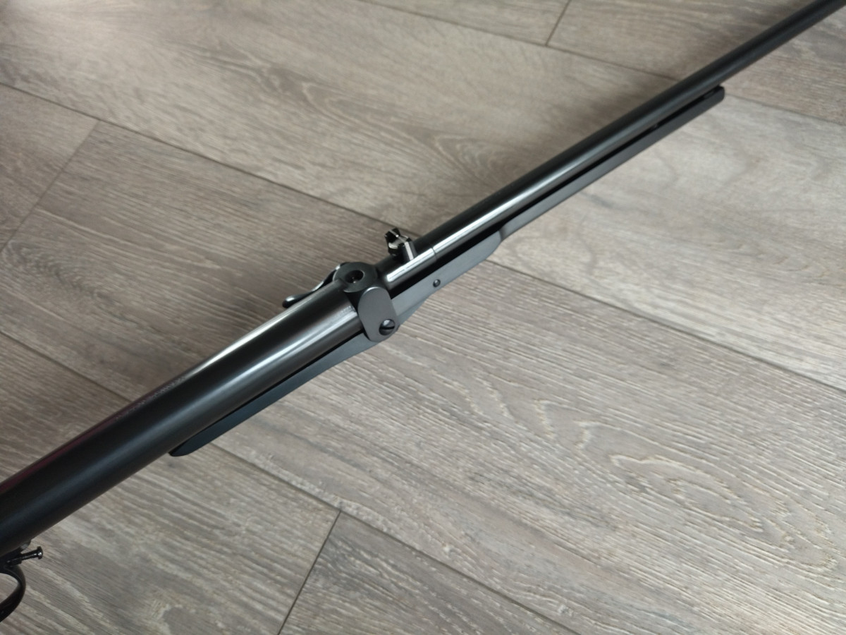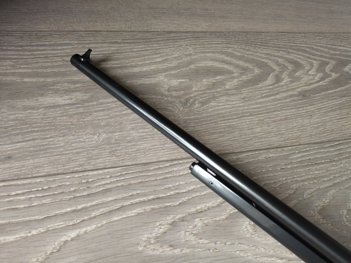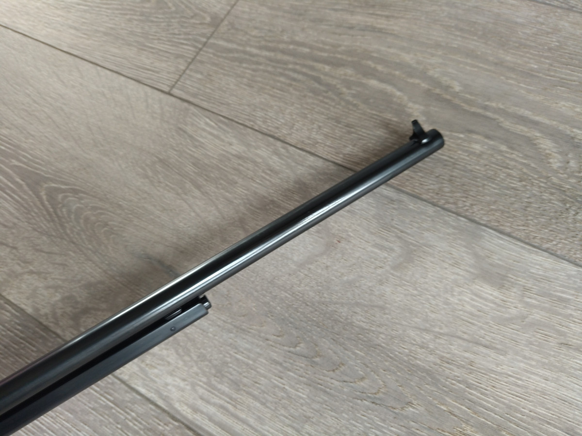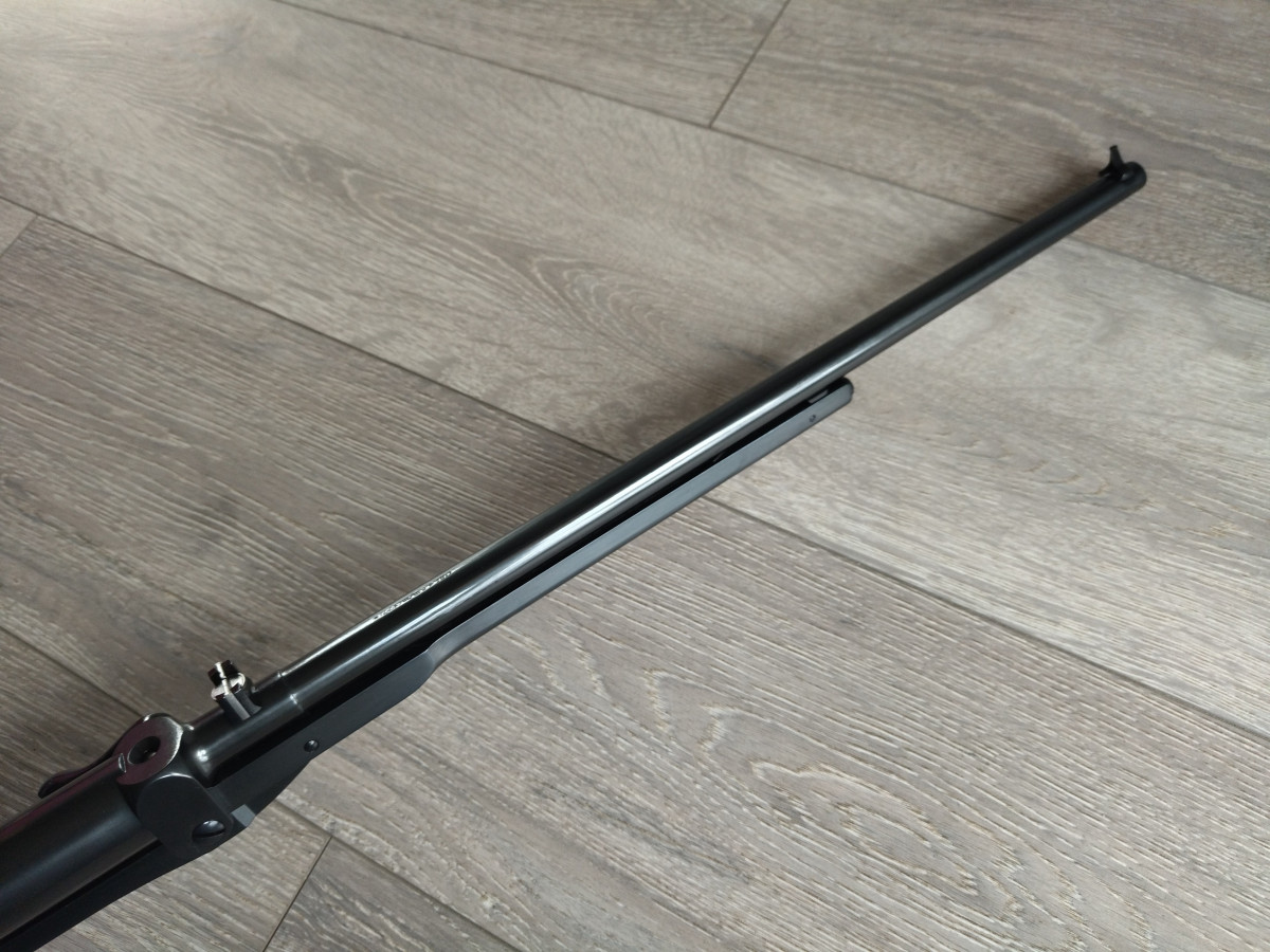 Einzellader unterhebelspanner Luftgewehr, Kaliber 4.5 mm, Lauf gezogen, Länge 1100 mm, Gewicht ca. 3,5 Kg. Nussbaumholz Schaft.