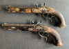 Zur Versteigerung steht dieses Pärchen Perkussionspistolen von Lorenz Bössel aus Suhl. Reisepistolen / Duellpistolen aus ca 1850. System ist intakt und wirkt von innen fast neuwertig , der Pistonschutz beweglich. Die Läufe sind glatt mit einem Kaliber von 12mm.Die Pistons sind jedoch durch abschlagen verschlossen. Der Zahn der Zeit ist leider an diesen Pistolen nicht spurlos vorbeigegangen und dienten bei mir als Vitrinenmodelle. Dennoch sind es Belegstücke vergangener Zeit. An den Mündungen saßen wohl mal Hornabschlüsse, die nicht mehr vorhanden waren. Weitere Bilder gerne auf Nachfrage. Bei Versand ins Ausland bitte Portokosten erfragen, keine Garantie oder Rücknahme, viel Spaß beim Bieten.