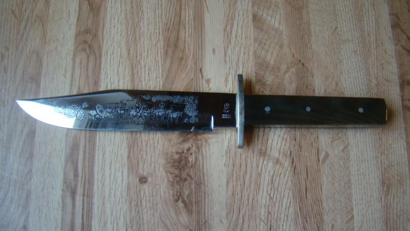 Schweres stabiles Fahrtenmesser, SAMMLER MESSER von Othello / Anton Wingen Jr, SOLINGEN, mit schön geätzter Bowieklinge ( Wild West Darstellung ) und Lederscheide. Beides absolut neuwertig u. unbenutzt, Klinge spiegelblank, siehe Bilder.