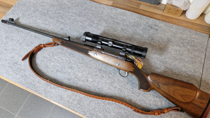 Die Waffe kann jederzeit in 69514 besichtigt und auf 100m Probe geschossen werden. Ca. 20 Schuss Jagdmunition und 35 Stück Scheibenmunition werden mitgegeben.