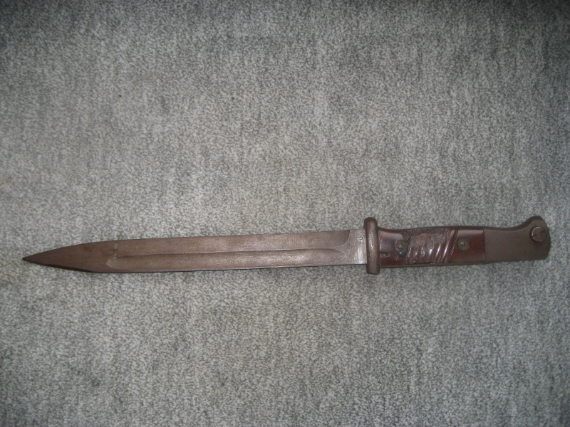 biete aus einer alten Sammlung ein SG 84/98er Bajonett (3. Ausf.), links Herst. "asw" ("Hörster, Solingen"), rechts "049, darunter ff" (nur sehr schwach eingeprägt, siehe Bild 3), oben am Knaufende die WaA Abnahme. Das Bajo in einem super Zustand mit brauner Patina, kein Rost oder tiefe Rostnarben. Es war scheinbar nie brünniert. Gab es die auch mal blankbelassen oder Bräuniert? Das Feuerschutzblech wie neu, ohne Dellen, die Klinge ebenfalls sehr gut, Drücker frei. Leider haben die Griffschalen Abplatzungen. Wer die tauschen möchte, ich biete in einer anderen Auktion noch ein Paar Griffschalen an. Das Bajo. ist ohne Scheide.