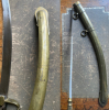 Curved, single-edged blade, 47 cm long and 3 cm wide, with a long counter-edge, traces of leaf decoration and indescribable maker's marks.