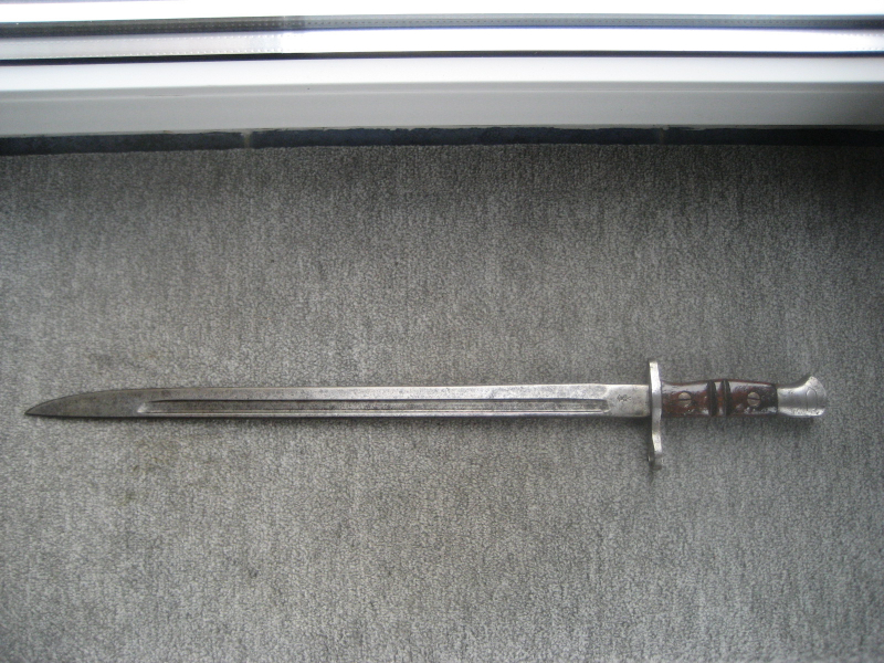 biete aus einer alten Sammlung ein Bajonett für das Enfield P 13/14 Gewehr, "Sword Bajonet Pattern 1913 MK I", Hersteller "Remington". links 1913, darunter 17 und darunter Remington im Kreis (Bild 2) rechts siehe Bild 3. Das Bajo im schönen Zustand, keine tiefen Rostnarben, Klinge fleckig. Griffschalen sehr schön, noch mit dem Originallack. Drücker frei. Leider ohne Scheide.