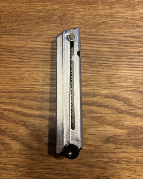 Ich verkaufe hier aus meinem Bestand ein gebrauchtes Magazin passend für eine Mauser P08. Der Boden ist Kunststoff. Das Magazin ist eine Erma Fertigung. Der Zustand ist den Bildern zu entnehmen. Geliefert wird, wie auf den Fotos zu sehen.
