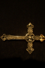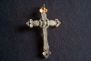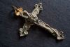 Kettenanhänger Skelett am Kreuz. Aus 925er Sterlingsilber und 18 k Gelbgold. Rückseitig gestempelt: S 925, G 18ct. Sehr filigran gearbeitet. Die feine Dornenkrone und die Nägel am Kreuz bestehen auch aus Gold. Neu und ungetragen mit Beutel und aufbewahrungsdose aus Metall. Das Kreuz ist 5 x 7 cm und wiegt 22g.