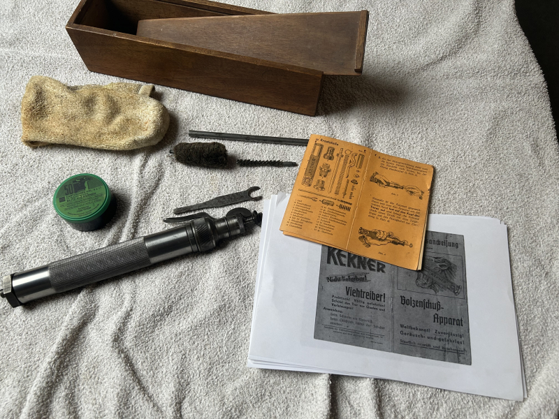 ohne Originalverpackung, mit Reinigungszubehör (siehe Fotos), Ersatzteillisten / Anleitung (Original + Kopie), Hülsenheber, 46 Stck. Kartuschen Kal. 9x17 GRÜN ( für Schweine und Kleinvieh), Oelsocken und Holzkiste.