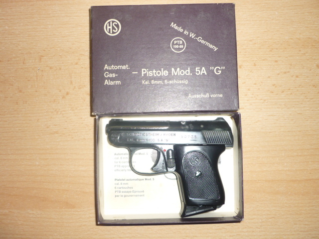 Aus meiner Sammlung ein ganz besonderer Leckerbissen eine HS Mod. 5A "G" PTB 100-69 , das ist die mit den Stahlstiften an der Mündung, kenner wissen es. Die Pistole wurde nicht benutzt und lag seit über 50 Jahren im originalen nummerngleichen Originalkarton. Die Pistole und der Originalkarton sind in sehr gutem Zustand, nach der langen Zeit sind Lagerspuren kaum vermeidbar und auch vorhanden. In diesem Zustand wohl kaum mehr zu finden. Lieferumfang: Pistole mit Magazin, nummerngleicher Originalkarton mit Anleitung. Mein Gun beachten.