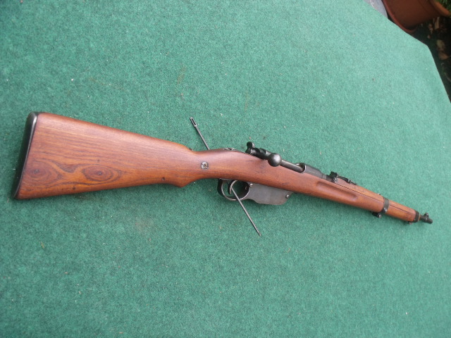 Umbau aus einem langen M. 95 Gewehr des ersten Jahres der Steyr Kontraktlieferung. Es wurden 88000 Gewehre zwischen 1903 und 1914 geliefert, von denen viele in den Balkankriegen und im 1. Weltkrieg verloren gingen. Der Stutzen trägt das bulgarische Wappen und die seitliche Gehäusebeschriftung Steyr 1903. Nur die Kontraktlieferungen für Bulgarien hatten Verschlüsse mit einer oben angebrachten Gasentlastungsbohrung (siehe Foto). Diese Verschlüsse waren auf dem Kammerstengelknopf mit der Waffennummer versehen, wie beim vorliegenden Stück. Der Verschluss ist nummerngleich zur Waffe, ebenso, wie der Schaft. Weitere nummerierte Teile sind nicht vorhanden. Die Seriennummer lautet 1713 E, der Truppenstempel H.3. 104. Das Holz und das Metall sind in gutem Zustand, der Lauf ist gut und blank. Das Kaliber wurde auf die neue Patrone 8x56R geändert. Es sind einige Exemplare bekannt, bei denen diese Änderung , nicht, wie üblich, mit einem S auf der Hülse gekennzeichnet wurden. Dieser Stutzen ist ebenfalls nicht gekennzeichnet worden. Der bundesdeutsche Neubeschuss wurde dezent unter dem Lauf angebracht. Steyr lieferte nur 2074 M.95 Karabiner an Bulgarien. Dies ist zwar ein Umbau aus einem Gewehr aber trotzdem ein seltenes Sammlerstück, das ich z.Zt nirgendwo im Angebot finde. Erwerbsberechtigung erforderlich - Auslandsabwicklung über deutschen Exporteur Ihrer Wahl - Privatverkauf aus eigener, langjähriger Sammlung