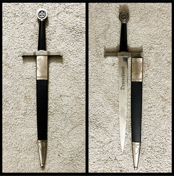 Der Dolch wird ohne verbotene Insignien ausgeliefert und ist damit legal erhältlich.