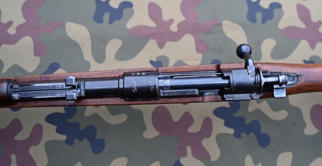 Herstellerlogo „S/42“ und Jahreszahl „1937“ oben auf der Hülse, linksseitig „Mod. 98“, viele „WaA“-Stempel auf Lauf, allen Schlossteilen, Visier, Hülse und Beschlägen (WaA63). WaA-Abnahmen auch auf beiden kleinen Sicherungsschraubenköpfen.