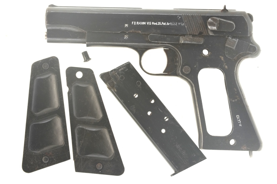 Auf dem Schlitten sehr gut lesbar „F.B.RADOM VIS Mod. 35. Pat.Nr. 15567.", diverse WaA-Stempel (Adler über 77)Seriennummer. Bundesrepublikanische Beschusszeichen von 1969 links auf dem Rahmen und auf dem Schlitten.