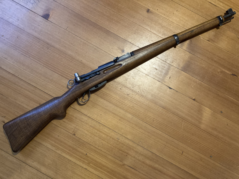 Schweizer K31, nummerngleich inkl. Magazin, gute Schussleistung. Die Waffe ist lt. Seriennummer von 1943. Der Lauf ist spiegelblank, der Schaft wurde von einem Schäftemacher professionell aufgearbeitet und ist in sehr gutem Zustand. Der Vorderschaft weist eine kleine Ausbesserungsstelle auf, diese ist zwischen den vorderen Schaftringen als kleiner Fleck zu sehen. Bis auf etwas Abrieb im Mündungsbereich ist die Brünierung für das Alter der Waffe in Ordnung. Weiteres Zubehör zum K31 in meinen anderen Auktionen. Versand in die EU wäre z.B. durch die Fa. Waffen Bock Pirmasens möglich. Selbstabholung kein Problem.