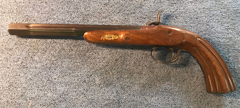 Sie bieten auf eine gebrauchte, ältere Replika einer Perkussions-Duellpistole im Kaliber .45 eines mir unbekannten spanischen Herstellers. Die Pistole verfügt über keinen Stecher, der brünierte Lauf weist feine Haarzüge auf. Die Kimme ist nur in der Höhe verstellbar, das Korn ist sehr fein. Die Pistole weist Gebrauchsspuren auf. Die Abgabe erfolgt nur an Personen, die das 18. Lebensjahr vollendet haben. Die Bilder sind Bestandteil der Beschreibung.