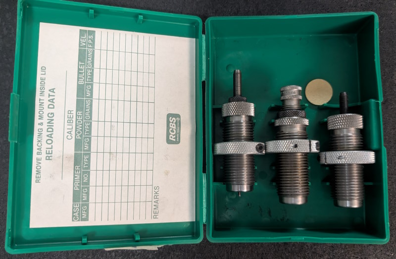 Verkaufe im Auftrag einen Matrizensatz von RCBS, Kaliber 9mm Luger (9x19). Bestehend aus einer Vollkalibriermatrize mit Hartmetalleinsatz und Zündhütchenausstoßer, Aufweitmatrize und einer Setzmatrize. Verkauf in Original RCBS Box. Die Matrizen scheinen weing genutzt worden zu sein.