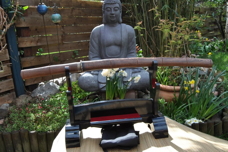 Wunderschönes handgeschmiedetes Wakizashi Schwert. Die Klinge im Shinogi-Zukuri-Stil besitzt eine Hohlkehle (Bo-Hi) und ist aus handgeschmiedetem 1045 Kohlenstoffstahl. Sie ist scharf geschliffen und hat eine eingearbeitete Hamon-Linie für eine besonders authentische Optik. Die Scheide des Schwertes ist aus Wenge-Holz gefertigt. Die lange Angel ist mit 1 Bambusstiften (Mekugi) im Griff fixiert. Das Schwert ist somit voll zerlegbar. Die Klingenzwinge (Habaki) und Unterlegscheiben (Seppa) sind aus Messing. Die Lieferung erfolgt mit Schutzhülle. Grifflänge 23 cm Klingenlänge 52cm Gesamtlänge (ohne Scheide) 1060 cm Gewicht (ohne Scheide) 800gr . Ohne Ständer