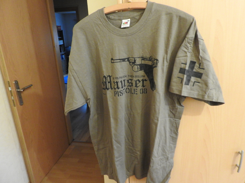 Biete neues, ungetragenes feldgraues T-Shirt mit Mauser 08 Aufdruck und Spruch: Si vis pacem,para bellum.Auf dem linken Ärmel ist ein Balkenkreuz aufgedruckt.