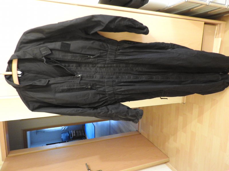 Biete neuwertige Mechanikerkombi (Schwarzkombi) in der Größe XL. Die Kombi hat auf der linken Brustseite ein Klettpet zur Befestigung von Namensschild oder Dienstgrad.Auf der Brust rechts und links je eine senkrechte Reißverschlusstasche. An der Hüfte ein Zuggummi, sowie rechts und links eine Eingrifftasche mit Reißverschluss. Rechts und links auf den Oberschenkeln je eine Quertasche mit Reißverschluss