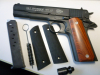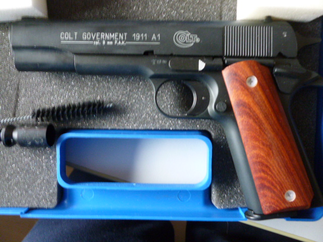 COLT Government 1911 -A1, Gas- und Schreckschußpistole, P.A.K. Kal. 9mm. PTB 774, brüniert, Gewicht 1000 g.Die Pistole hat Holzgriffschalen und NEU, Waffe wurde nie abgefeuert, lag nur im Schrank nur mal zur Trockenfunktion ausprobiert. Mit dabei ein 8 Schuss- Magazin, ein Abschußbecher, eine Reinigungsbürste, Bedienungsanleitung und die original Kunststoffgriffschalen. Geliefert wird sie in dem blauen original Colt- Koffer. Die Gas- Signal- Version der berühmten Colt Government 1911 A1 überzeugt in Verarbeitung und Funktion. Privatverkauf: Kein Umtausch, keine Rücknahme, keine Garantie.