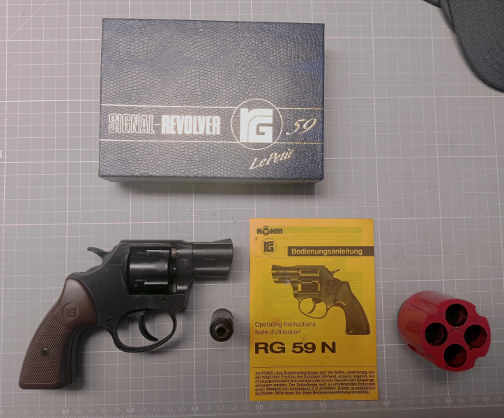 Ich habe hier einen Röhm RG 59 Signalrevolver abzugeben. Dabei ist die Originalverpackung mit Bedienungsanleitung, ein Single-Abschussbecher für Leuchtkugeln etc. und ein 4-Fach Abschussbecher. Der Revolver wurde von mir für Sylvester benutzt und ist in einem sehr guten Zustand. Der Versand erfolgt versandkostenfrei per DHL über Alterssichtprüfung.