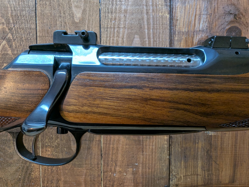 Selten geführter Stutzen Sauer 202 Luxus im Kaliber .308Win. Stahlgehäuse .Der Schaft mit bayrischer Backe, ist tief dunkel gemasert . Die Kammer ist mit einem Sonnenschliff versehen. Beim Abzug handelt es sich um einen trocken stehenden Flintenabzug. Basen einer Schwenkmontage sind montiert. Stahlmagazin. An der Waffe befinden sich minimale Gebrauchsspuren am Schaft , ansonsten ist die Waffe in einem tadellosem Zustand, keine erkennbare Schussbelastung. Lauflänge 51cm, Gesamtlänge ca.103 cm. Weitere Bilder übersende ich gern auf Anfrage.