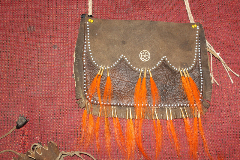 jagdtasche im style 18jrh america.dickes gefärbtes hirschleder besatz mit messingtinns und weisswedelhirschhaaren, tradesilver. ca.24x20cm. neu und sehr stabil verarbeitet! sehr autentisch gefertigt,kein western deko mist.