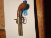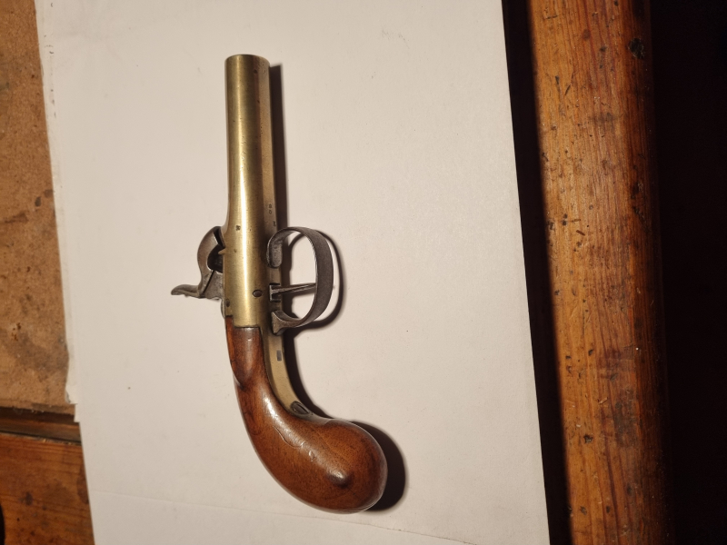 Kleine Stiefel oder Mantelpistole, Länge16,5 cm, Glattlauf, Messing, Cal. 11mm. Anscheinend nie geöffnet. Hahn repariert (Stahlstifft eingezogen), starke Feder. Gemarkt ELG und andere Marken.
