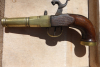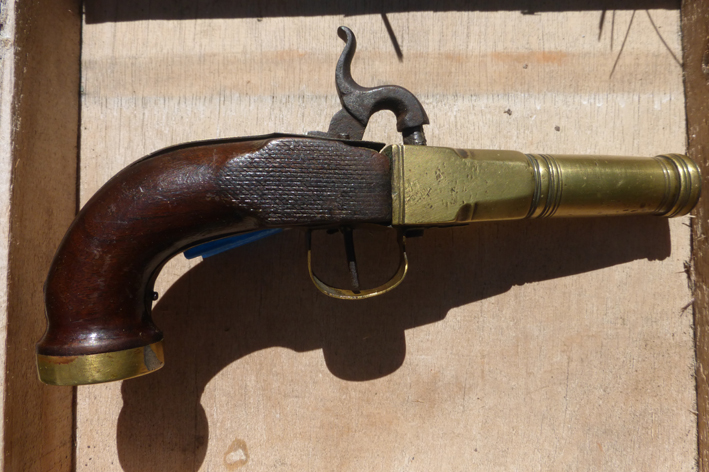 Vorderlader Pistole (schwer, Marine?) in gutem Zustand aus Sammlung. Lauf und Beschlag aus Messing. Gesamtgewicht 450 g. Die Pistole befindet sich in funktionsfähigem Zustand. Starke Federn sind intakt, das Schloß lässt sich in einer Stufe spannen und abschlagen, der Abschlag ist kräftig. Die Pistole hat eine Gesamtlänge von ca. 200 mm, Lauflänge ca. 100 mm. Der Lauf hat einen Innendurchmesser von ca. 9 mm und einen dickwandigen Aussendurchmesser von ca. 20 mm. Es handelt sich um ein altes Original, mit Gebrauchs/Alterungsspuren. Weiterer Zustand siehe Bilder. Bilder sind Teil der Beschreibung. Versand nur innerhalb Deutschlands.