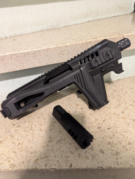 Verkauft wird ein Conversion Kit mit Gebrauchsspuren, dazu der passende Mündungsfeuerdämpfer, der sich laut Beschreibung als Glasbrecher nutzen lässt. Der Anschlagschaft kostet neu etwas mehr als 300 € und das Verlängerungsstück für die Mündung etwa 100 €. Die abgebildete Glock ist nicht Teil der Auktion sondern dient nur der Illustration! Es handelt sich um einen Privatverkauf ohne Garantie, Gewährleistung, Rücknahme, Umtausch etc. Ich habe das Set zusammen mit der Pistole erworben, um damit die entsprechenden BDS-Disziplinen schießen zu können. Allerdings ist es nicht dazu gekommen und das Teil lag ungenutzt in meinem Keller. Eine EWB ist nicht erforderlich. Der Anschlagschaft soll sich für alle Glocks aller Kaliber eignen. Auf Wunsch gibt es gern weitere Fotos, aber ich denke, die notwendigen Infos findet man auch online.