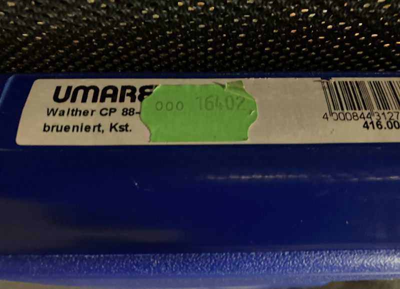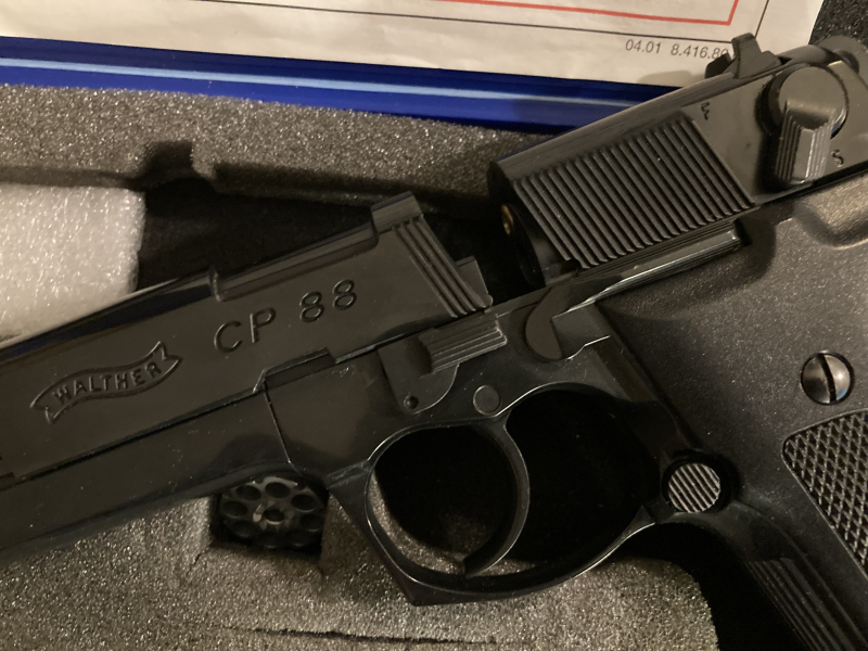 Umarex Walther CP 88 Luftdruck CO2 Pistole, wie abgebildet mit Zubehör im Waffenkoffer.