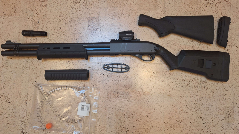 Magpul Hinter- und Vorderschaft, Magpul Riemenbügelhalter hinten und vorne, Scattergun Technology Magazinzubringer inkl. Feder, Nordic Components geschmiedeter Auszieher, Tactical Choke und Cylinder Choke